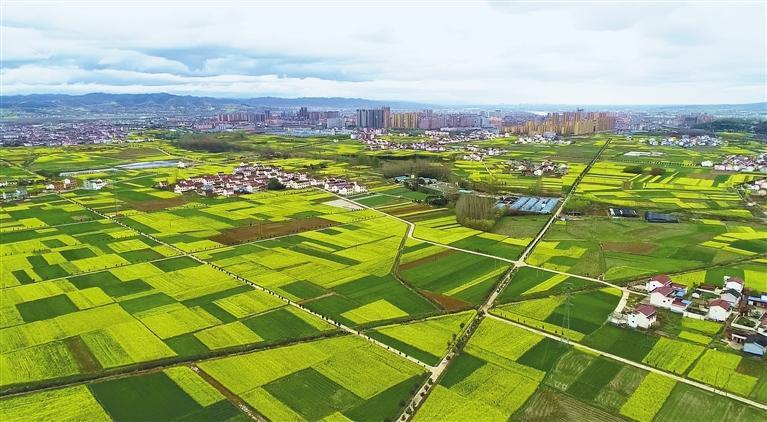 位于洋县戚氏街道七眼泉村黄绿相映的油菜花田和麦田(3月11日摄)。 本报通讯员 李刚摄
