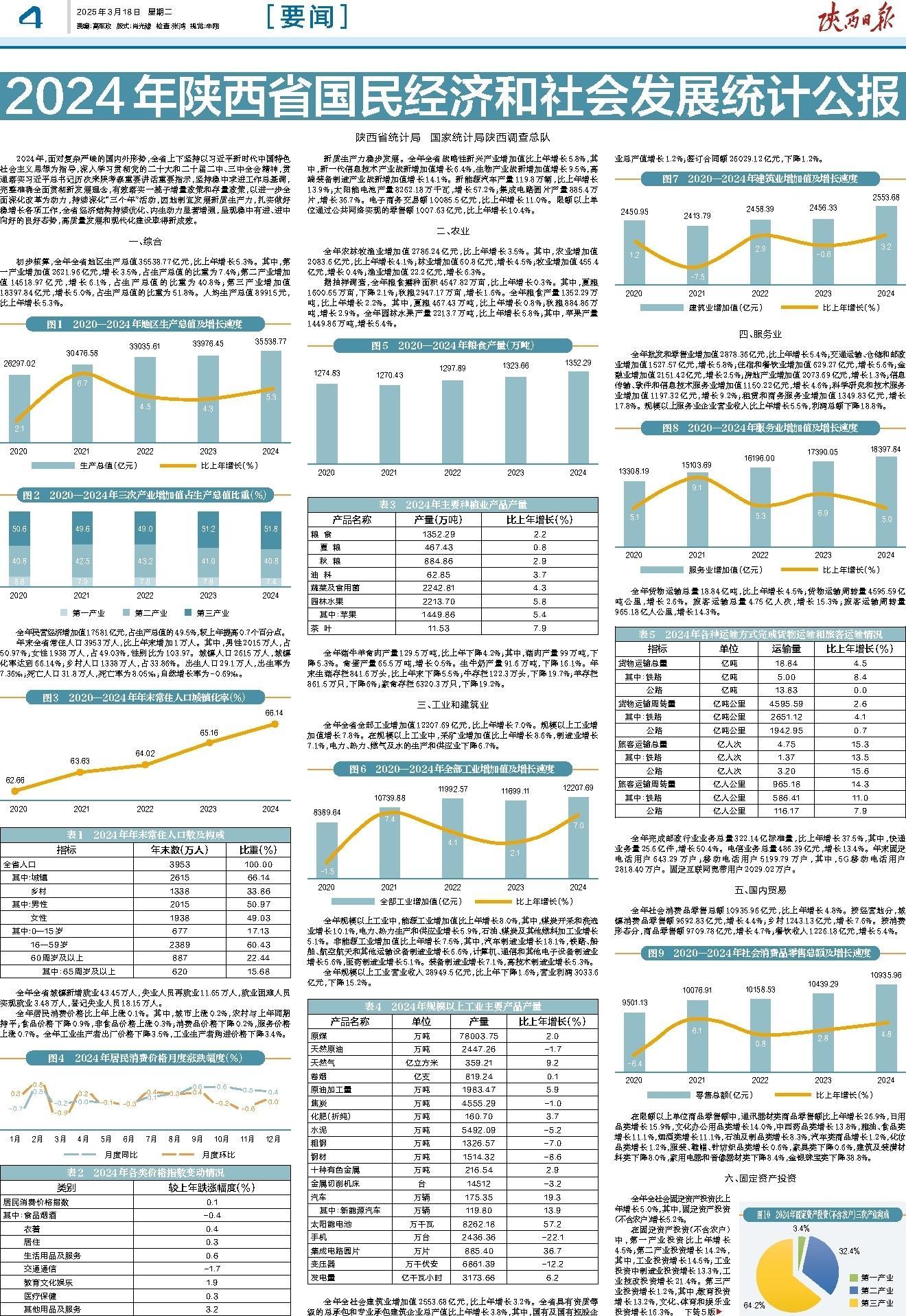 2024年,面对复杂严峻的国内外形势,全省上下坚持以习近平新时代中国特色社会主义思想为指导,深入学习贯彻党的二十大和二十届二中、三中全会精神,贯通落实习近平总书记历次来陕考察重要讲话重要指示,坚持稳中求进工作总基调,完整准确全面贯彻新发展理念,有效落实一揽子增量政策和存量政策,以进一步全面深化改革为动力,持续深化“三个年”活动,因地制宜发展新质生产力,扎实做好稳增长各项工作,全省经济结构持续优化、内生动力显著增强,呈现稳中有进、进中向好的良好态势,高质量发展和现代化建设取得新成效。