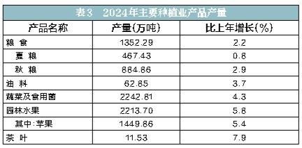据抽样调查,全年粮食播种面积4547.82万亩,比上年增长0.3%。其中,夏粮1600.65万亩,下降2.1%;秋粮2947.17万亩,增长1.6%。全年粮食产量1352.29万吨,比上年增长2.2%。其中,夏粮467.43万吨,比上年增长0.8%;秋粮884.86万吨,增长2.9%。全年园林水果产量2213.7万吨,比上年增长5.8%;其中,苹果产量1449.86万吨,增长5.4%。