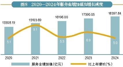 全年批发和零售业增加值2878.36亿元,比上年增长5.4%;交通运输、仓储和邮政业增加值1527.57亿元,增长5.8%;住宿和餐饮业增加值629.27亿元,增长5.6%;金融业增加值2151.42亿元,增长2.5%;房地产业增加值2073.69亿元,增长1.3%;信息传输、软件和信息技术服务业增加值1150.22亿元,增长4.6%;科学研究和技术服务业增加值1197.32亿元,增长9.2%;租赁和商务服务业增加值1349.83亿元,增长17.8%。规模以上服务业企业营业收入比上年增长5.5%,利润总额下降18.8%。