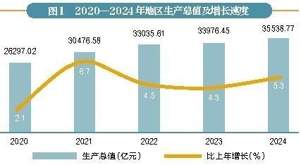 初步核算,全年全省地区生产总值35538.77亿元,比上年增长5.3%。其中,第一产业增加值2621.96亿元,增长3.5%,占生产总值的比重为7.4%;第二产业增加值14518.97亿元,增长6.1%,占生产总值的比重为40.8%;第三产业增加值18397.84亿元,增长5.0%,占生产总值的比重为51.8%。人均生产总值89915元,比上年增长5.3%。