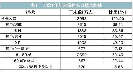 年末全省常住人口3953万人,比上年末增加1万人。其中,男性2015万人,占50.97%;女性1938万人,占49.03%,性别比为103.97。城镇人口2615万人,城镇化率达到66.14%;乡村人口1338万人,占33.86%。出生人口29.1万人,出生率为7.36‰;死亡人口31.8万人,死亡率为8.05‰;自然增长率为-0.69‰。