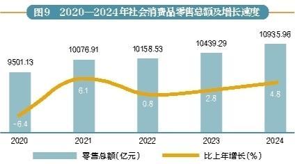 全年社会消费品零售总额10935.96亿元,比上年增长4.8%。按经营地分,城镇消费品零售额9692.83亿元,增长4.4%;乡村1243.13亿元,增长7.6%。按消费形态分,商品零售额9709.78亿元,增长4.7%;餐饮收入1226.18亿元,增长5.4%。