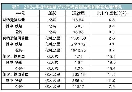 全年货物运输总量18.84亿吨,比上年增长4.5%;货物运输周转量4595.59亿吨公里,增长2.6%。旅客运输总量4.75亿人次,增长15.3%;旅客运输周转量965.18亿人公里,增长14.3%。