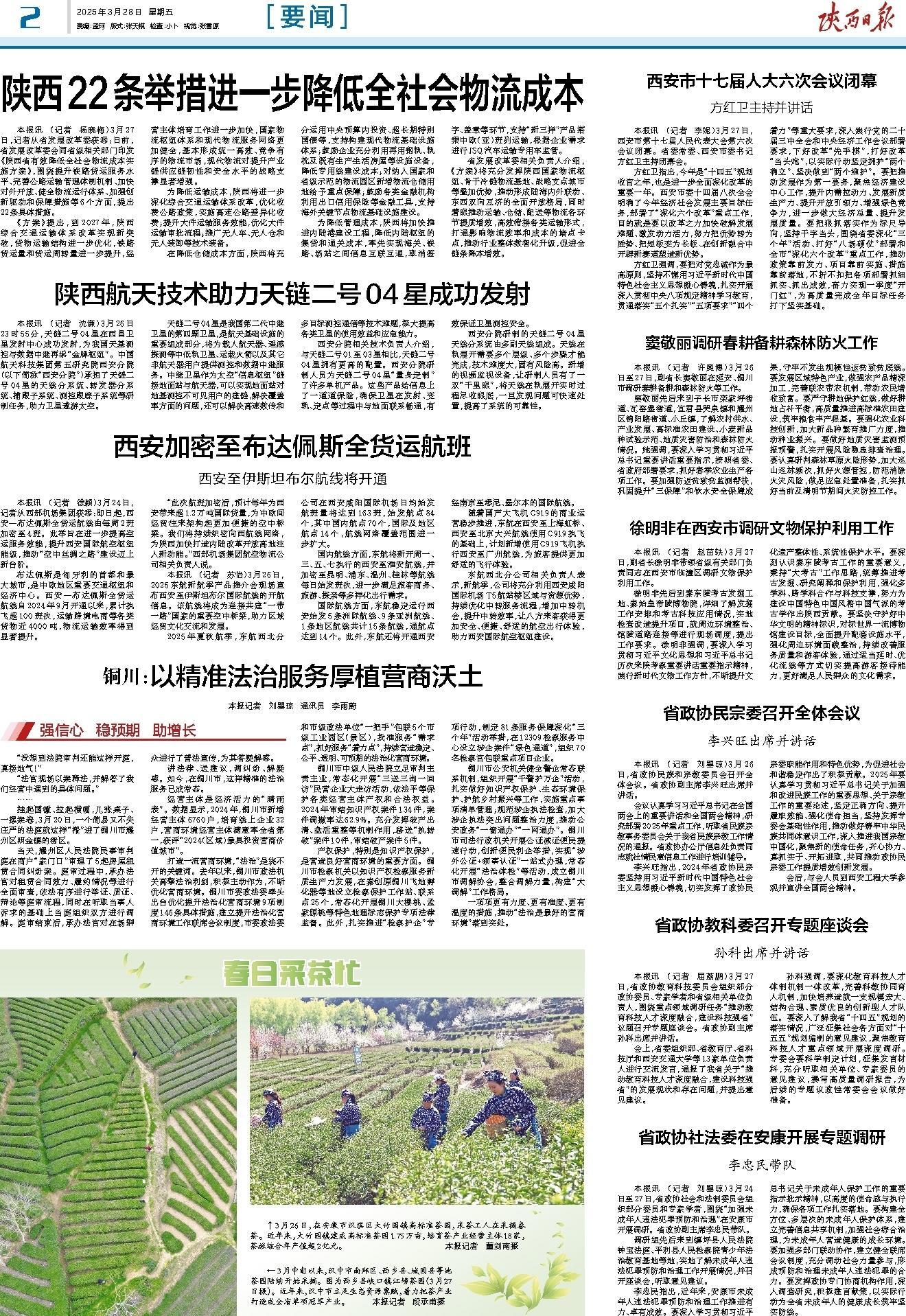 窦敬丽先后来到子长市栾家坪街道、瓦窑堡街道,宜君县哭泉镇和耀州区锦阳路街道、小丘镇,了解农村供水、产业发展、高标准农田建设、小麦新品种试验示范、地质灾害防治和森林防火情况。她强调,要深入学习贯彻习近平总书记重要讲话重要指示,按照省委、省政府部署要求,抓好春季农业生产各项工作。要加强防返贫致贫监测帮扶,巩固提升“三保障”和饮水安全保障成果,守牢不发生规模性返贫致贫底线。要发展区域特色产业,做强农产品精深加工,完善联农带农机制,带动农民增收致富。要严守耕地保护红线,做好耕地占补平衡,高质量推进高标准农田建设,筑牢粮食丰产根基。要强化农业科技创新,加大新品种繁育推广力度,推动种业振兴。要做好地质灾害监测预报预警,扎实开展风险隐患排查治理。要认真研判森林草原火险形势,加大巡山巡林频次,抓好火源管控,防范消除火灾风险,做足应急处置准备,扎实抓好当前及清明节期间火灾防控工作。