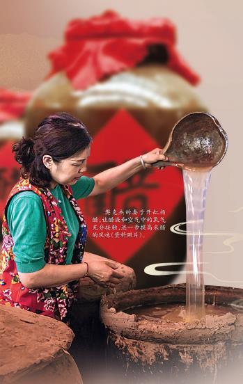 樊克杰的妻子开缸扬醋,让醋液和空气中的氧气充分接触,进一步提高米醋的风味(资料照片)。