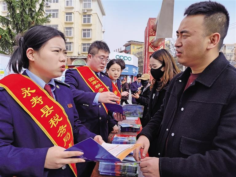 四月一日,国家税务总局永寿县税务局开展第三十四个全国税收宣传月活动,向群众宣传税法、税收优惠政策。本报通讯员 李建龙摄