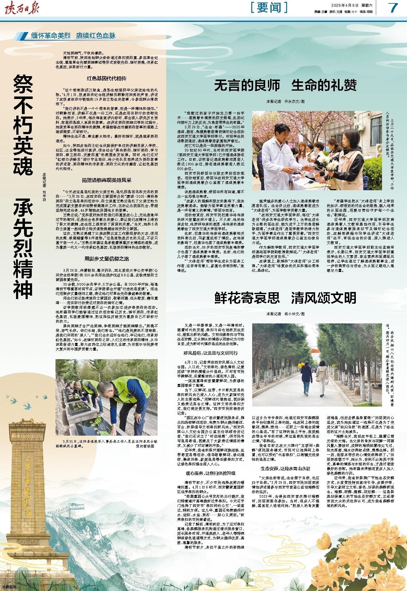 近年来,西安交通大学医学部发挥遗体捐献人文教育基地作用,引导学生参与遗体捐献服务环节及缅怀纪念活动,在解剖课程中向学生讲述“大体老师”生平,审视生命的价值,深入推进人文教育。