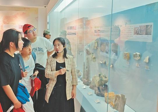 4月22日,在三秦远古生物化石展厅,观众在听化石标本讲解。