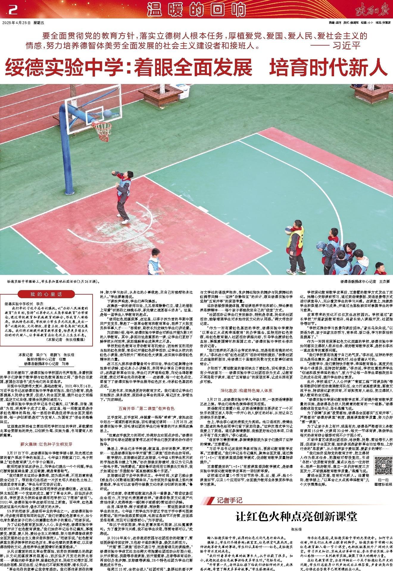 我们牢记习近平总书记嘱托,以“办好人民满意的教育”为目标,坚持“以革命之火点亮幸福教育”办学理念,通过学校教育和家庭教育的融合,形成育人新格局。依托特色社团,学校助力学生多元化发展,走出一条“以德润校、文化领校、质量立校、特色亮校”的发展之路。我们将不断提升教育教学质量,培养更多堪当大任的时代新人,让幸福教育在红色沃土上生生不息。 (本报记者 张乐佳整理)