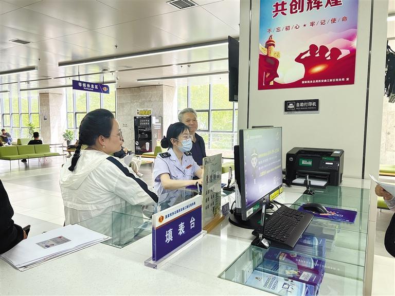 4月22日,在国家税务总局西安曲江新区税务局办税服务厅,工作人员协助市民办理业务。