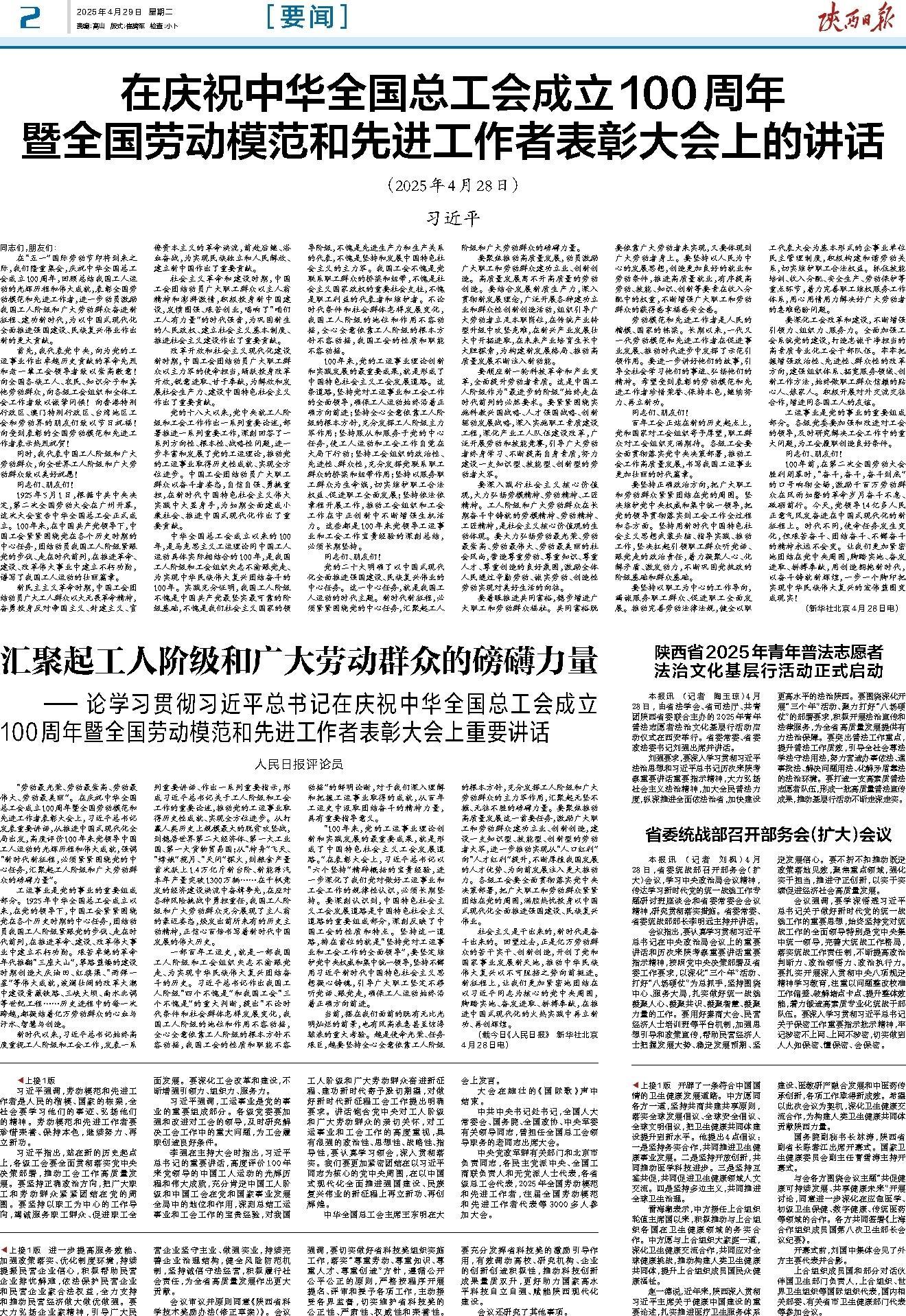 在“五一”国际劳动节即将到来之际,我们隆重集会,庆祝中华全国总工会成立100周年,回顾总结我国工人运动的光辉历程和伟大成就,表彰全国劳动模范和先进工作者,进一步动员激励我国工人阶级和广大劳动群众奋进新征程、建功新时代,为以中国式现代化全面推进强国建设、民族复兴伟业作出新的更大贡献。