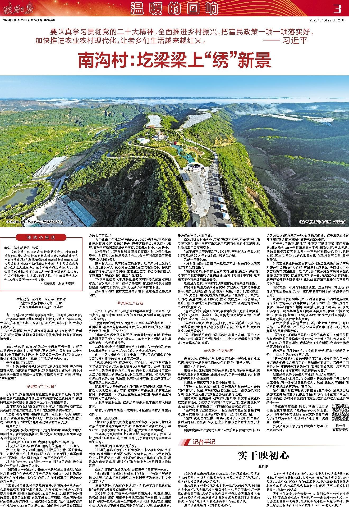 南沟村党支部书记张润生自豪地说:“我们的苹果卖到国内多个城市,很多国际友人还在我们村认养了苹果树。”一颗颗红彤彤的苹果,见证了当地党员干部群众夯实高质量发展之基的坚实步伐,映照着黄土高原由荒山荒坡到草木葱茏的转变,书写着“绿水青山就是金山银山”的生动实践。