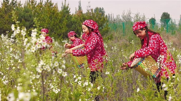 在靖边县杨桥畔苗圃,工人在采摘文冠果树叶(资料照片)。