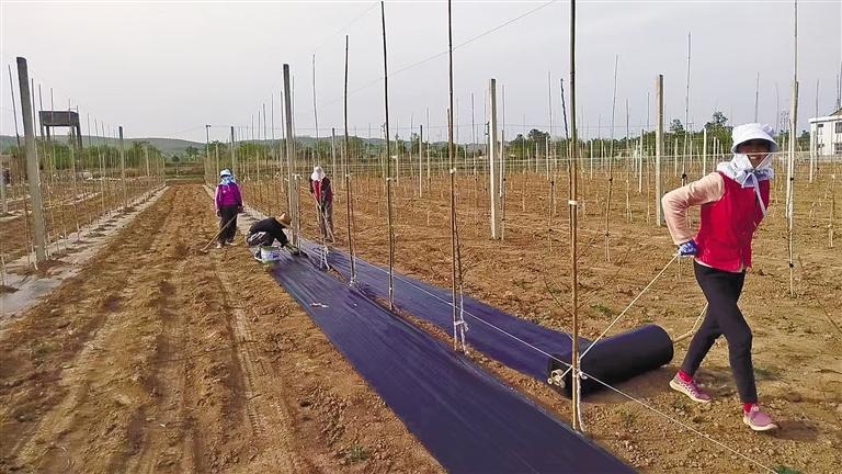 4月21日,果农在淳化荣立家庭农场的瑞雪苹果示范园铺设地膜。