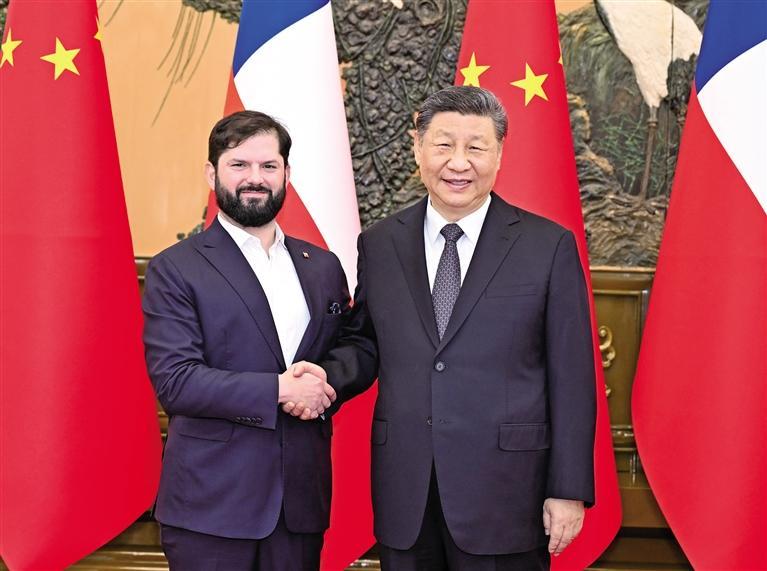 博里奇表示,智利高度重视对华关系。中国已成为智利最重要的贸易伙伴,双方合作造福了两国人民。智方将坚定奉行一个中国原则,期待与中方进一步拓展贸易、投资、人工智能等领域合作,高质量共建“一带一路”,密切人文交流,推动智中关系取得更多实实在在的成果。各国应坚持自由贸易和互利共赢,贸易不应只服务于一国私利,发动贸易战没有出路。智方愿同中方一道,坚定捍卫多边主义和联合国权威,坚持通过对话解决分歧,共同维护国际公平正义。
