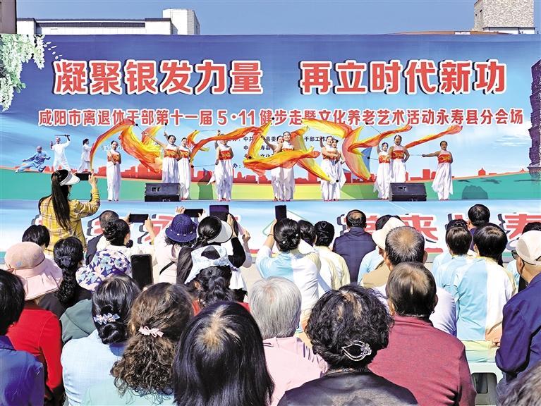 5月10日,永寿县在中心广场举办健步走暨文化养老艺术活动。当天,老年人进行了健步走并欣赏了舞蹈、独唱、秦腔、旗袍秀等节目。图为永寿县老年大学学员在表演舞蹈。 本报通讯员 李建龙摄