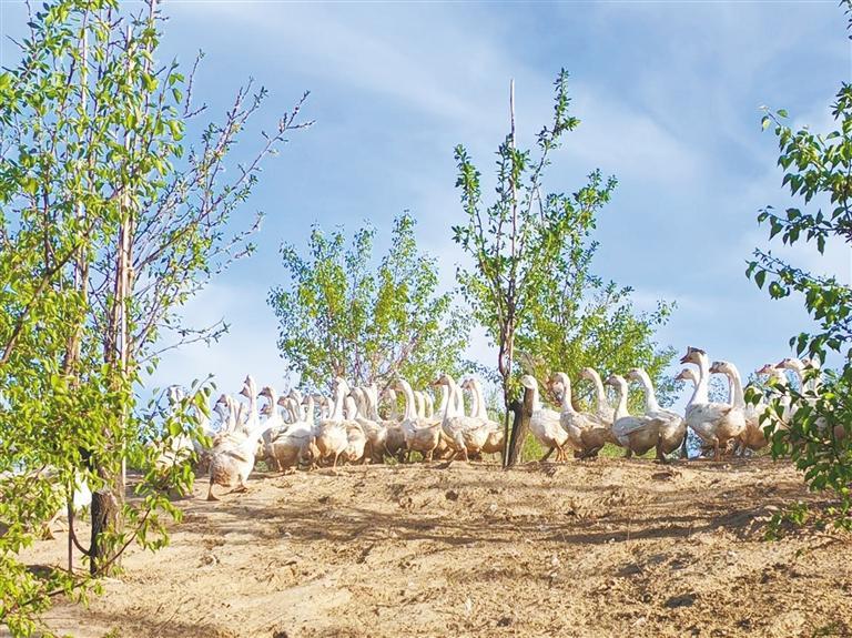 5月10日,榆阳区鱼河镇李家沟村亚平家庭农场里,一群大鹅在西梅树下觅食。 本报通讯员 赵星瑞摄