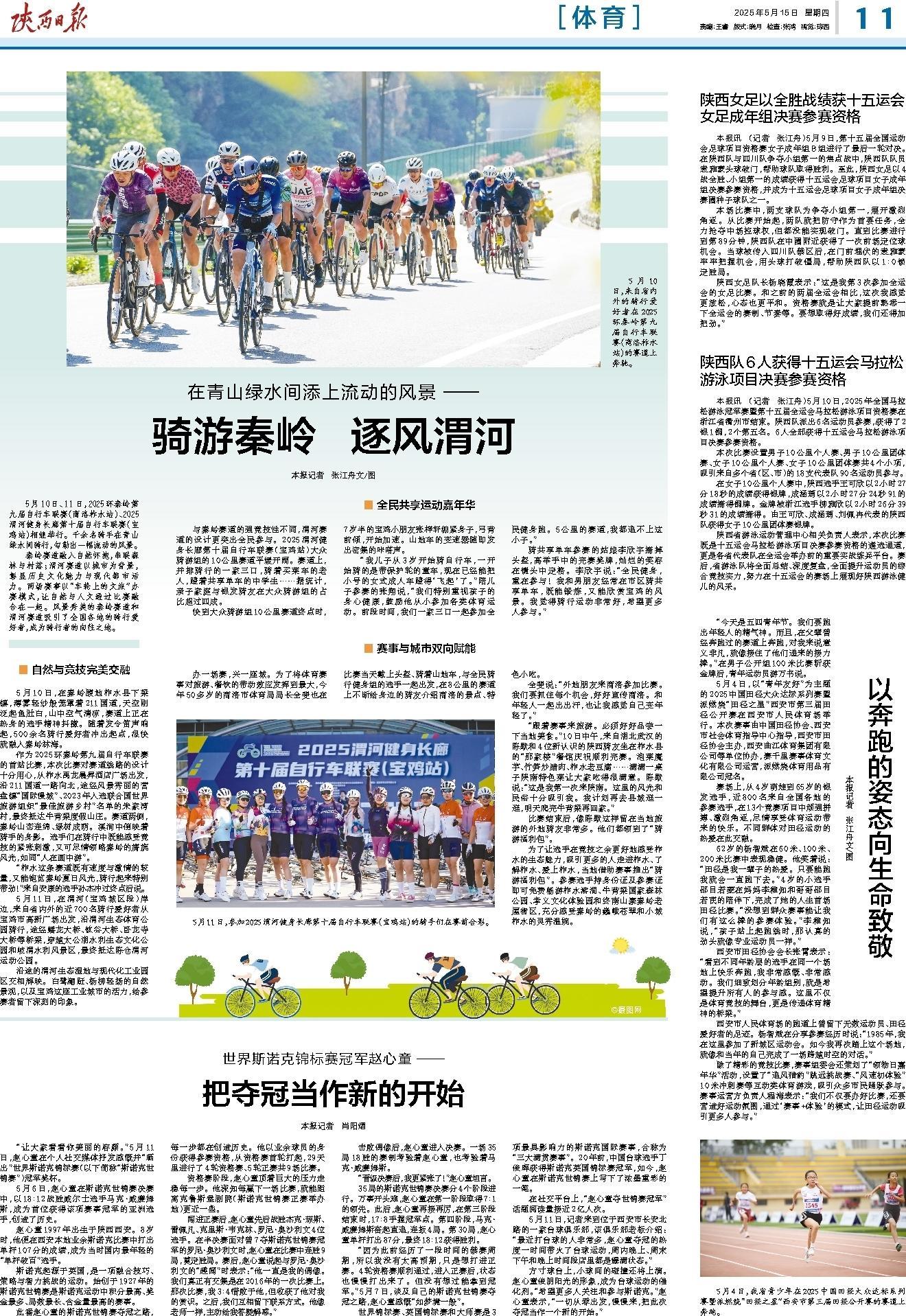 5月10日、11日,2025环秦岭第九届自行车联赛(商洛柞水站)、2025渭河健身长廊第十届自行车联赛(宝鸡站)相继举行。千余名骑手在青山绿水间骑行,勾勒出一幅流动的风景。