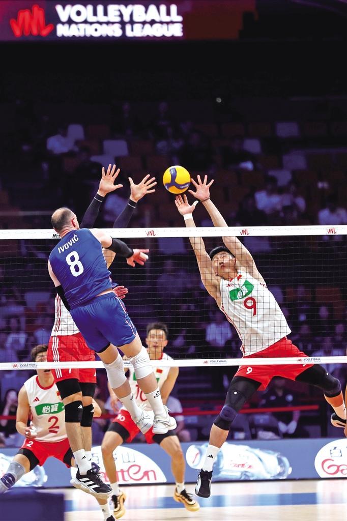本报讯 (记者 肖阳熠文/图)6月12日,2025世界男排联赛(中国西安站)展开第二个比赛日角逐。中国男排3∶0战胜塞尔维亚男排。