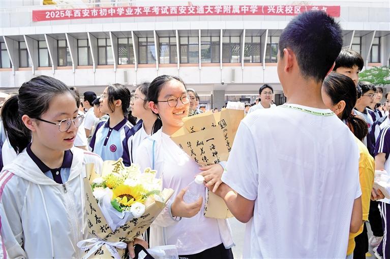 6月23日,2025年陕西省初中学业水平考试结束。图为当天中午,在西安交通大学附属中学(兴庆校区)考点前,家人为考生送上鲜花。 本报记者 杜玮摄