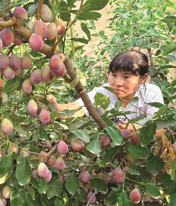 7月13日,在大荔县西城街道谷多村的大棚里,果农在采摘成熟的西梅。 本报通讯员 李世居摄