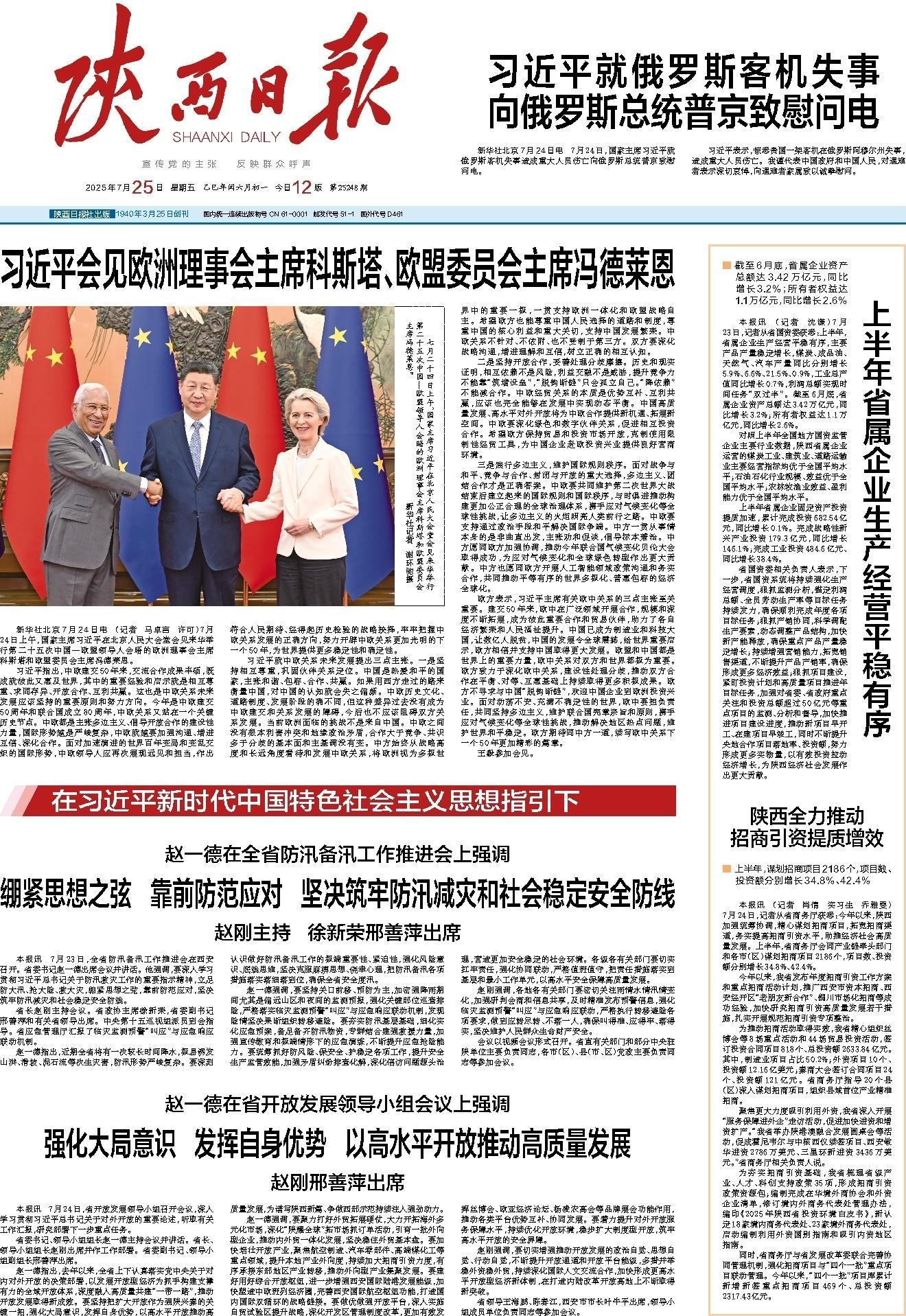 赵一德强调,要聚力打好外贸拓展硬仗,大力开拓海外多元化市场,深化“陕耀全球”拓市场抓订单活动,引育一批外向型企业,推动内外贸一体化发展,坚决稳住外贸基本盘。要加快培壮开放产业,聚焦航空制造、汽车零部件、高端煤化工等重点领域,提升本地产业外向度,持续加大招商引资力度,有序承接东部地区产业转移,推动外向型产业集聚发展。要建好用好综合开放枢纽,进一步增强西安国际陆港发展能级,加快塑造中欧班列经济圈,完善西安国际航空枢纽功能,打造国内国际双循环的战略链接。要做优做强开放平台,深入实施自贸试验区提升战略,深化开发区管理制度改革,更加有效发挥丝博会、欧亚经济论坛、杨凌农高会等品牌展会功能作用,推动各类平台优势互补、协同发展。要着力提升对外开放服务保障水平,持续优化开放环境,稳步扩大制度型开放,筑牢高水平开放的安全屏障。