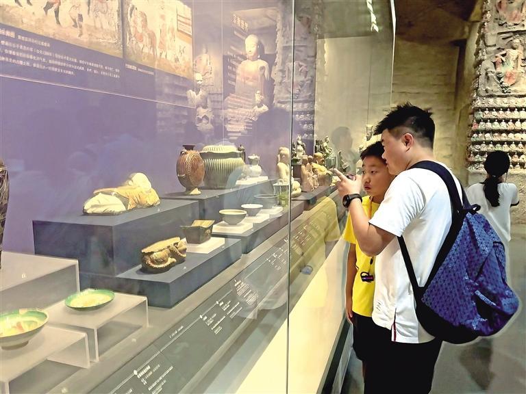 7月23日,陕西历史博物馆内熙熙攘攘。福建游客罗奇纬带着孩子穿行其中,震撼于展厅陈列的精美文物。他们在第三展厅一处玻璃展柜前驻足,吸引他们停下脚步的是一尊女子侧卧造型的瓷枕。