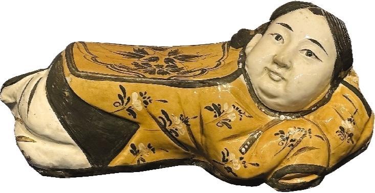 白釉黑花卧美人枕造型优美,制作精湛,装饰独特,是扒村窑出产的一件不可多得的珍品。