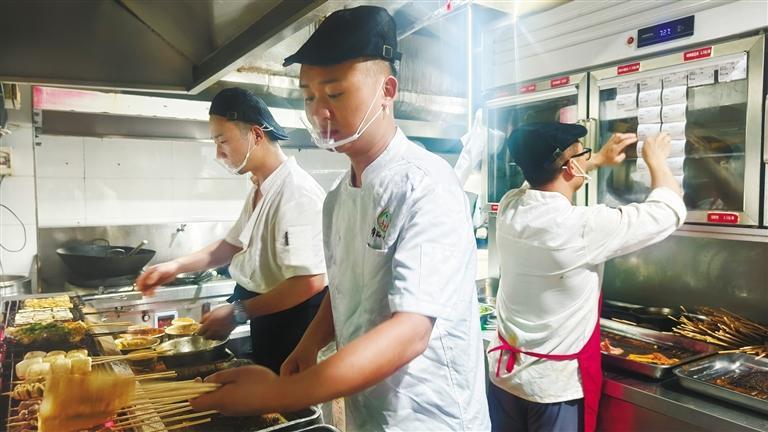 8月19日,“幸福小馆”的老板陈业刚(中)在后厨烤串。 本报通讯员 聂国松摄