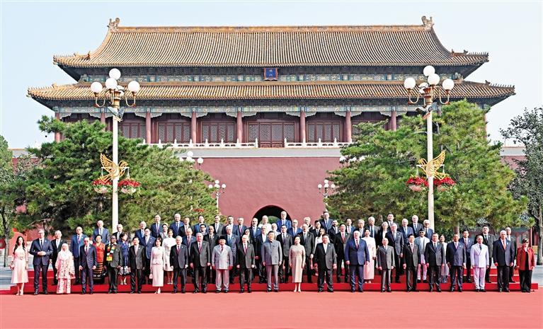 大会开始前,习近平和夫人彭丽媛在端门外广场迎接出席大会的外方代表团团长及其配偶,并同他们合影留念。