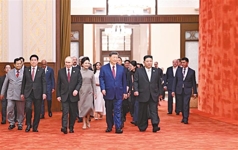 9月3日,纪念中国人民抗日战争暨世界反法西斯战争胜利80周年招待会在北京人民大会堂隆重举行。中共中央总书记、国家主席、中央军委主席习近平出席招待会并发表重要讲话。这是习近平和夫人彭丽媛同出席招待会的外国领导人夫妇共同步入宴会厅。 新华社记者 谢环驰摄