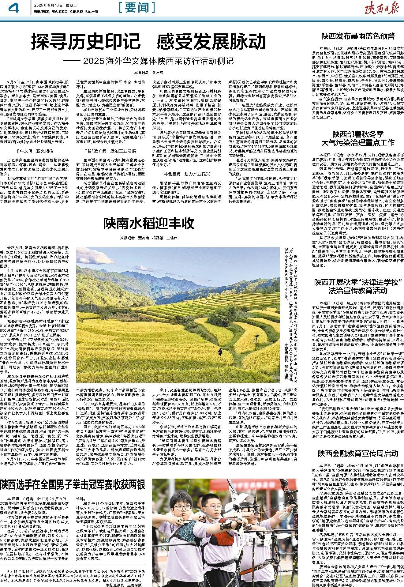 金秋九月,陕南地区稻浪翻滚、稻谷飘香,超过150万亩水稻陆续进入收获期。连日来,田间地头机器往来穿梭,农户抢抓晴好天气进行抢收作业,处处是繁忙的丰收图景。