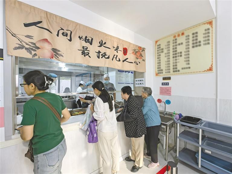 不到半小时,食堂就热闹起来。结伴而来的银发老人、带着孩子的年轻父母、刚下班的白领……大家陆陆续续坐满餐厅。一份份小碗装的小酥肉、蒜薹炒肉、蒸南瓜等美食冒着热气,暖意扑面而来。