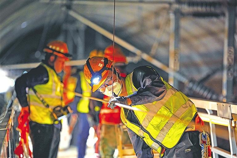 宝鸡供电段职工在隧道内完成列车接触网精调工作(资料照片)。