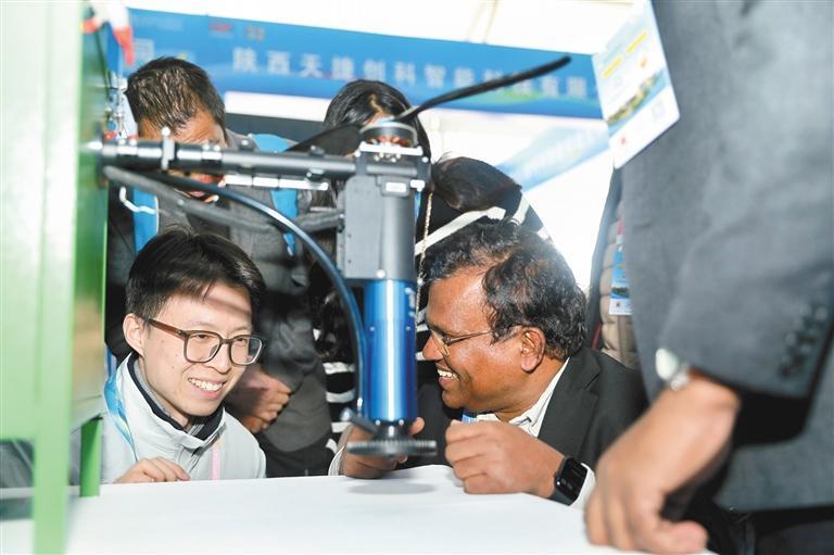 10月25日,在农高会农业智能装备专题展上,来自斯里兰卡的观众在了解一款天穹大棚智能打药机器人。 本报记者 许奥博摄