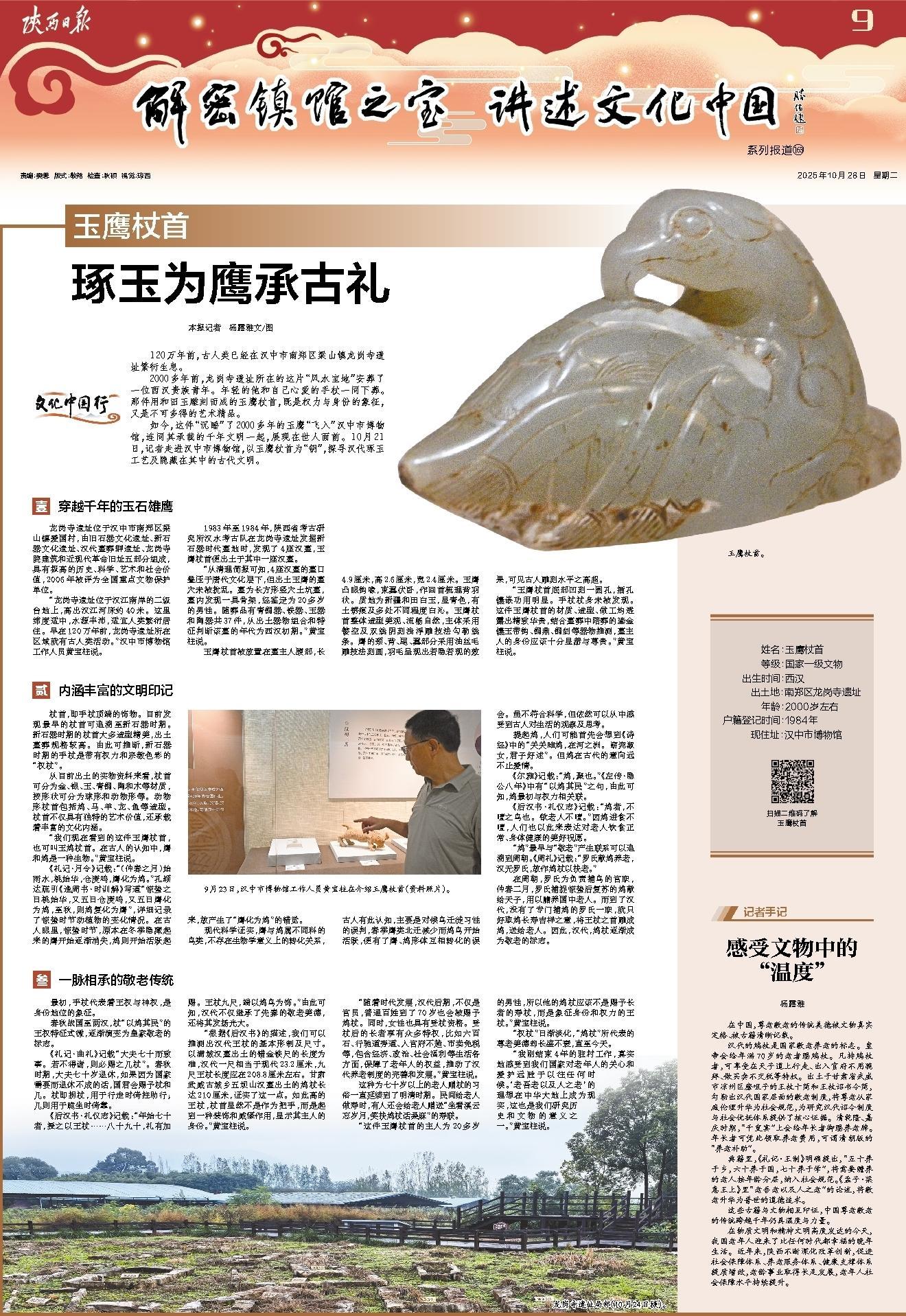 如今,这件“沉睡”了2000多年的玉鹰“飞入”汉中市博物馆,连同其承载的千年文明一起,展现在世人面前。10月21日,记者走进汉中市博物馆,以玉鹰杖首为“钥”,探寻汉代琢玉工艺及隐藏在其中的古代文明。