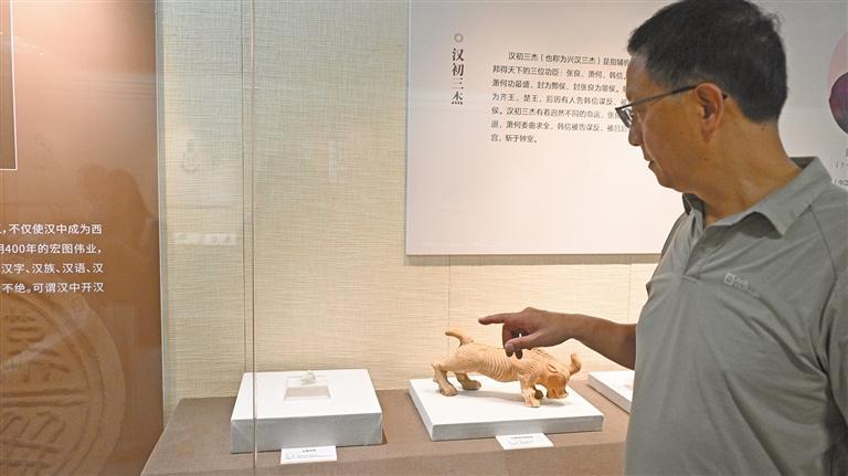 9月23日,汉中市博物馆工作人员黄宝柱在介绍玉鹰杖首(资料照片)。