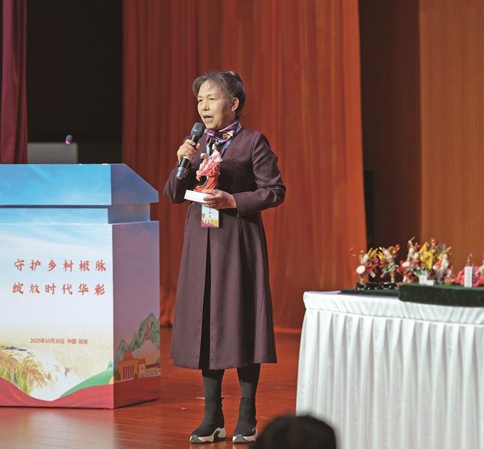 10月30日,中国文明乡风大会“保护传承农村文化遗产”分会场,延安市面花非遗项目代表性传承人雷小梅在介绍自己的作品。 本报记者 梁易炜摄