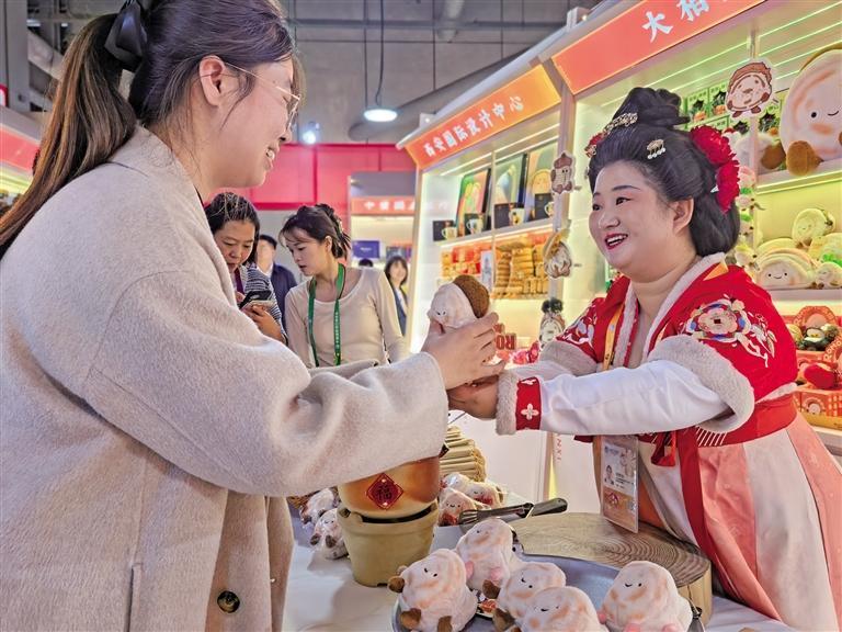 作为助推陕西从文物大省向文创热土转型的代表企业之一,陕西大相文博一直致力于将陕西文化元素转化为年轻化、创意化的文创产品。“公司持续深耕文创产业,今年进博会除了带来‘绒馍馍’毛绒玩偶这款爆款产品,还精挑细选了‘绿辣子夹馍’‘花干夹馍’‘紫皮蒜’‘长安的荔枝’等十余款新产品参展。”大相文博工作人员刘紫娟介绍,“进博会是一个绝佳的展示平台。我们希望通过‘绒馍馍’系列产品,让更多海外朋友关注陕西,了解陕西文化,进而投资陕西。”