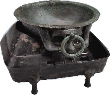 与这种用于温煮蘸料的小型食器不同,方盘形铜提链炉体量稍大,既可取暖,又可炙烤食物。