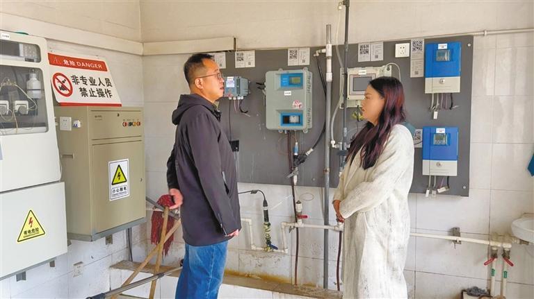 十一月六日,白雪(右)在延安市东川水厂采访。
