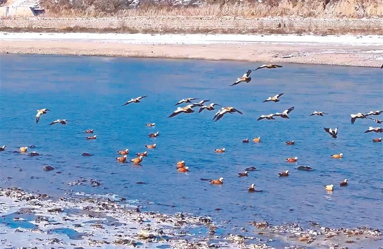 黄河岸边群鸟嬉戏。
