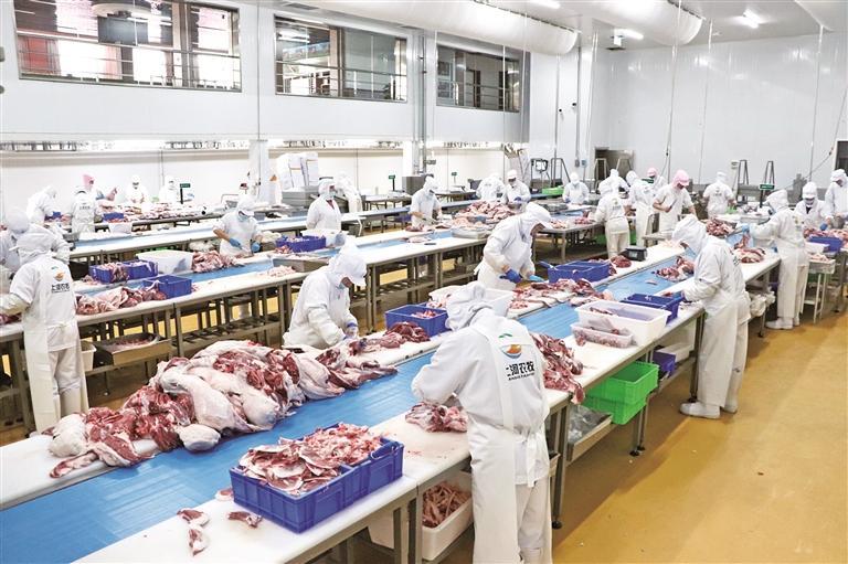 在陕西上河农牧业开发有限公司的现代化屠宰加工车间,智能化生产线高效运转。活畜经过严格检疫后,进入全自动屠宰流水线,随后进行精细分割和72小时低温排酸,每一个环节都紧扣安全标准。“我们从德国引进先进设备,建立标准化生产体系,通过72小时低温排酸能让羊肉表面形成天然的保护膜,不仅能锁住水分,阻止微生物侵入,还能让肉质更加鲜嫩细腻。”该公司销售总监王明介绍,为了满足多元消费需求,公司还开发了冷却肉、分割小包装、即食产品等多品类深加工产品线。其中,“上河农牧”“上河桃花羊”等本土品牌已通过电商平台销往全国各地,榆阳优质牛羊肉走上了更多消费者的餐桌。