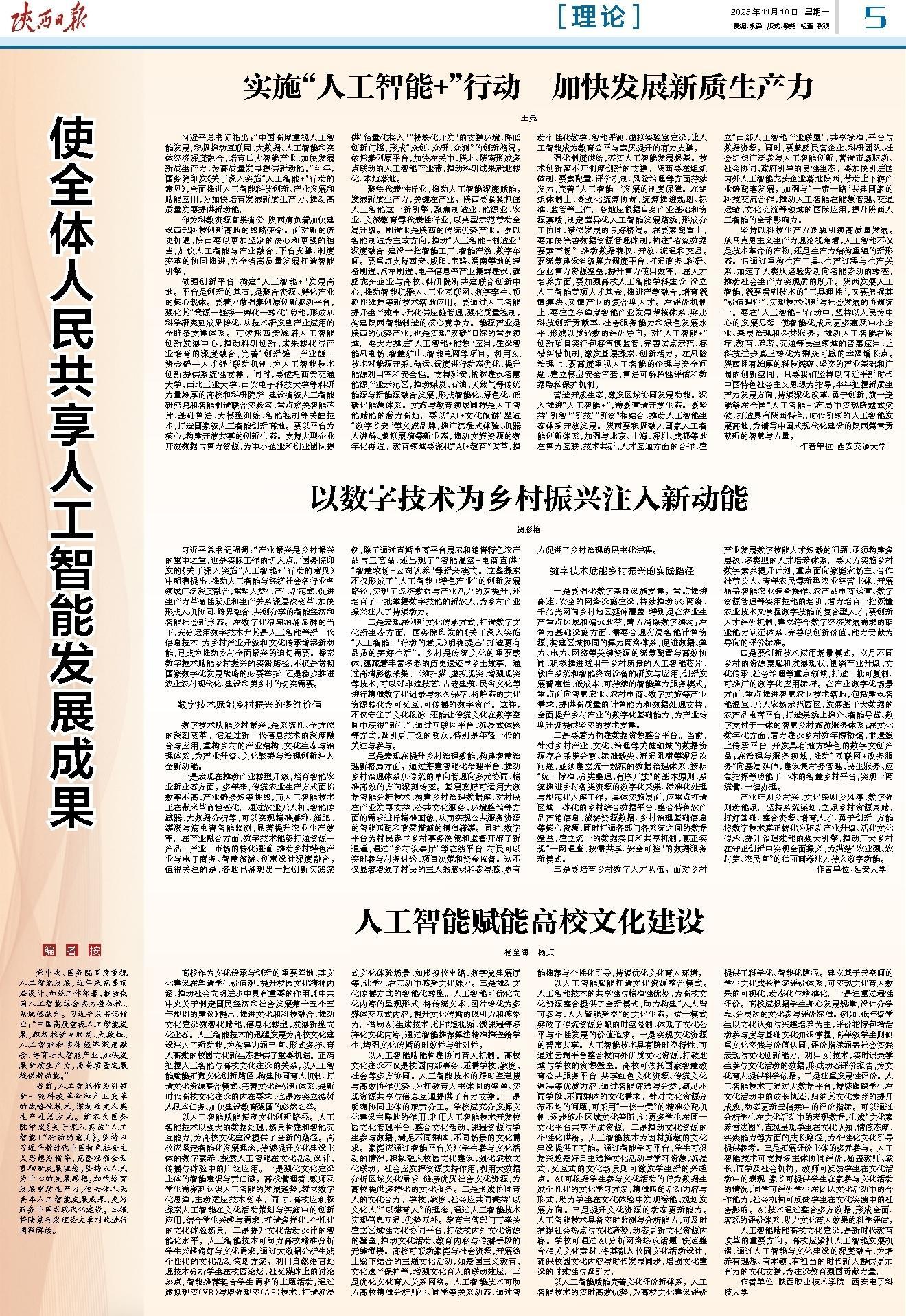 坚持以科技生产力逻辑引领高质量发展。从马克思主义生产力理论视角看,人工智能不仅是技术革命的产物,还是生产力结构重组的新形态。它通过重构生产工具、生产过程与生产关系,加速了人类从经验劳动向智能劳动的转变,推动社会生产力实现质的跃升。陕西发展人工智能,既要看到技术的“工具理性”,又要把握其“价值理性”,实现技术创新与社会发展的协调统一。要在“人工智能+”行动中,坚持以人民为中心的发展思想,使智能化成果更多惠及中小企业、基层治理和公共服务。推动人工智能在医疗、教育、养老、交通等民生领域的普惠应用,让科技进步真正转化为群众可感的幸福增长点。陕西拥有雄厚的科技底蕴、坚实的产业基础和广阔的创新空间。只要我们坚持以习近平新时代中国特色社会主义思想为指导,牢牢把握新质生产力发展方向,持续深化改革、勇于创新,就一定能够在全国“人工智能+”布局中实现跨越式突破,打造具有陕西特色、时代引领的人工智能发展高地,为谱写中国式现代化建设的陕西篇章贡献新的智慧与力量。