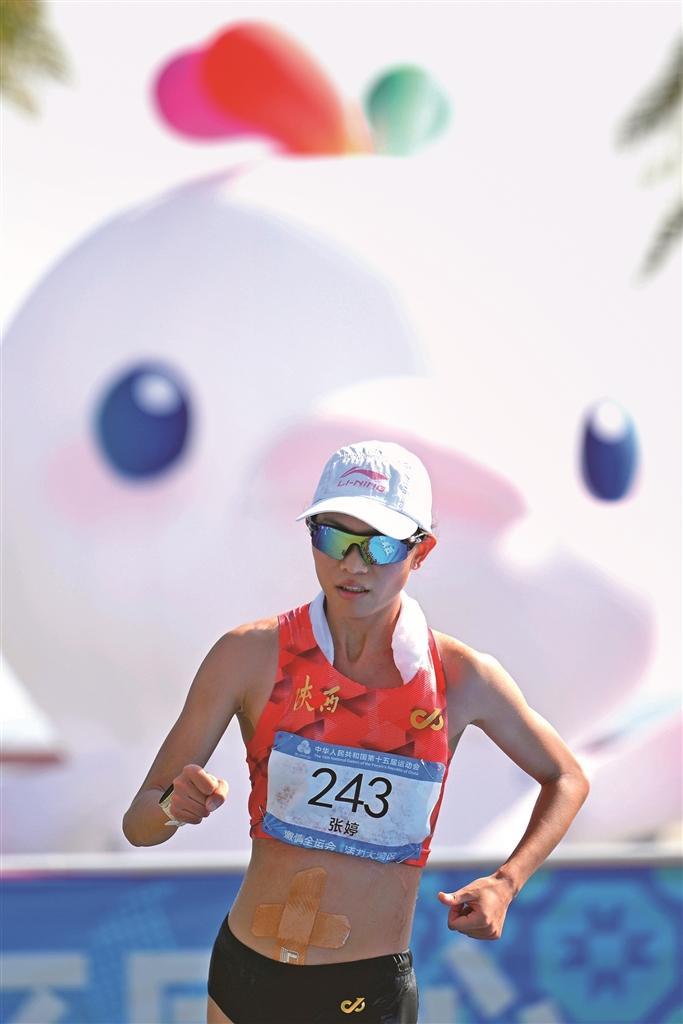 11月12日,第十五届全国运动会竞走项目男子、女子20公里比赛在珠海“最美滨海赛道”金湾路举行。图为陕西运动员张婷在赛道上与十五运会吉祥物同框。 本报记者 肖阳熠摄