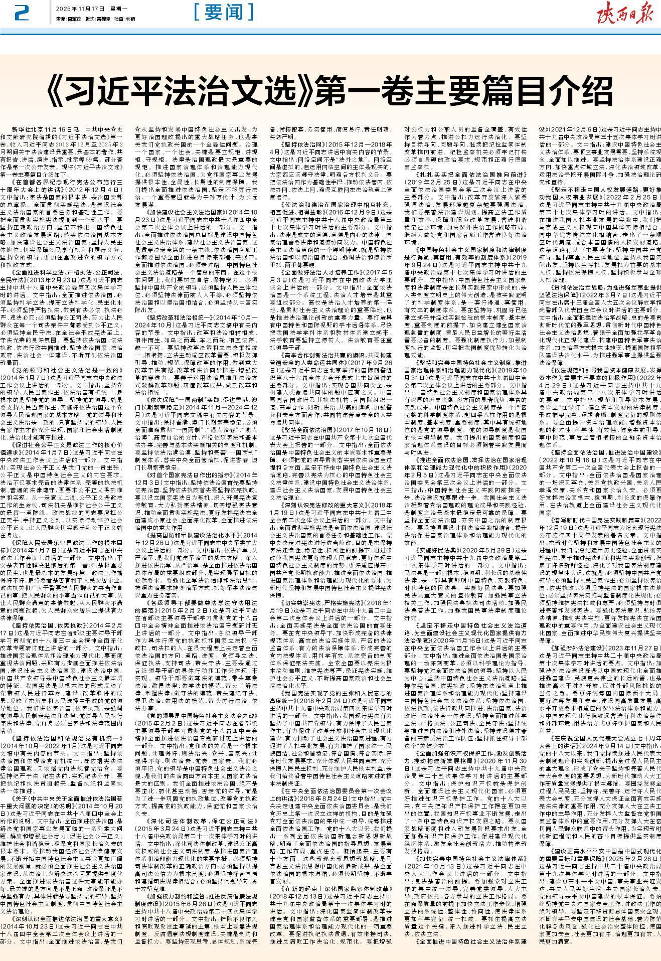 新华社北京11月16日电 中共中央党史和文献研究院编辑的《习近平法治文选》第一卷,收入习近平同志2012年12月至2025年2月期间关于法治建设最重要、最基本的著作,共有报告、讲话、演讲、指示、批示等69篇。部分著作是第一次公开发表。现将《习近平法治文选》第一卷主要篇目介绍如下。