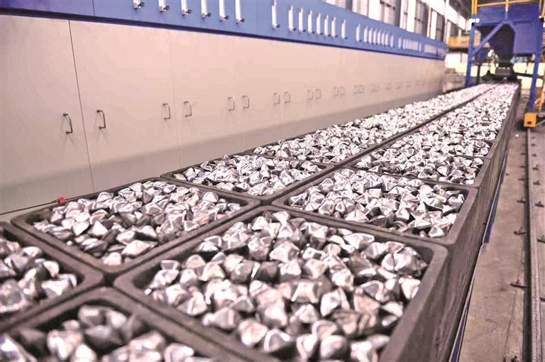 11月5日,在位于商南县试马镇的陕西中钒昌盛新材料科技有限公司的车间里,自动化生产线有序运行,金属轨道上运送着一筐筐银灰色的制品——钒氮合金。