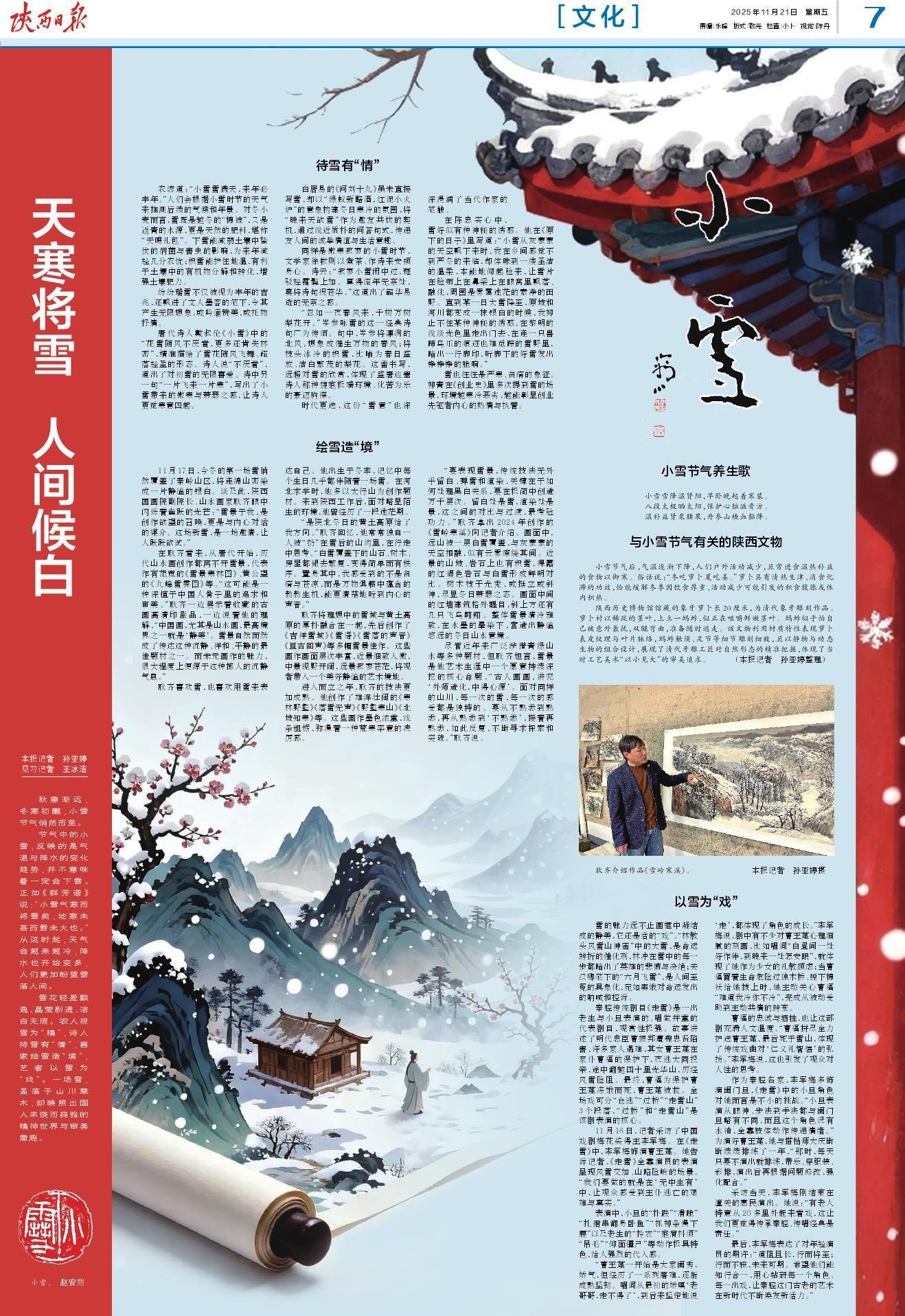 雪花轻盈飘逸、晶莹剔透、洁白无瑕。农人视雪为“精”,诗人待雪有“情”,画家绘雪造“境”,艺者以雪为“戏”。一场雪,虽落于山川草木,却映照出国人丰饶而典雅的精神世界与审美意趣。