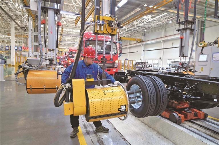 十一月二十日,在陕汽汽车总装配厂,工人忙着装配零件。